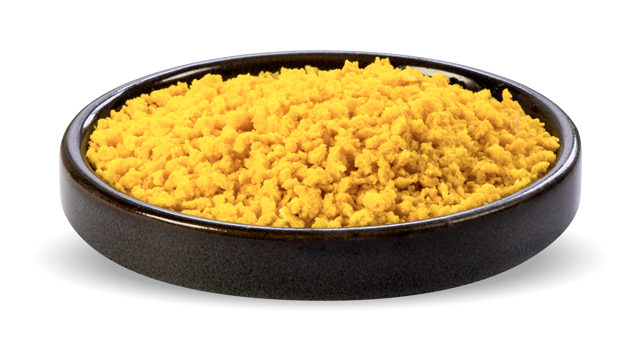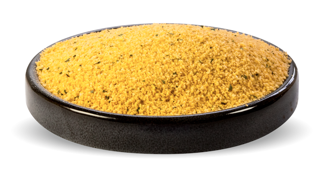 - Leuchtend gelbe Paniermehlmischung mit dezenter Knoblauchnote, gemischt mit Petersilie.